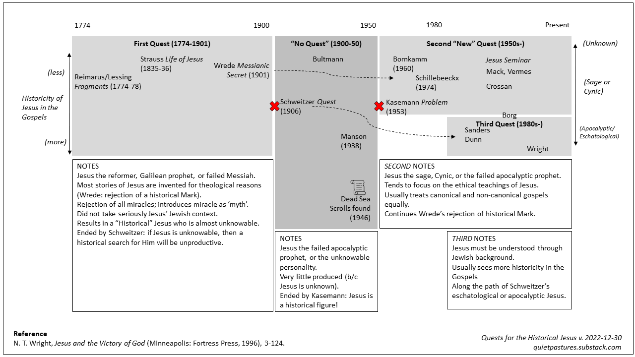 There may be a question as to why I have the Dead Sea Scrolls on a chart full of names. This discovery of Second Temple and second+third-century Jewish literature was a gold mine for understanding the first century. As a parallel, it would be like discovering the Federalist and Anti-Federalist papers millennia after America’s founding for those studying the Constitution (these papers were published prior to ratification of the Constitution); the Scrolls added historical depth to the study of the New Testament by providing much more cultural background and detail to the Jewish context. These discoveries have helped feed the conversations in both second and third quests.