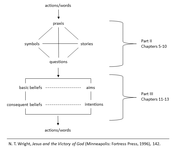 Wright argues one’s actions and words can reveal one’s worldview (though exposed more explicitly through the diamond’s parts); worldviews, in turn, drive's one’s beliefs and the activity that one is consciously aware of (worldview tends to be the thing through which we see). These in turn drive further actions and words. (It may be helpful to review my more detailed post on his chapter introducing this idea.) In NTPG, Wright discussed and carefully walked through each of these for the first century Jewish mindset (NTPG chapters 6-10). Wright now begins in the next chapter and through part II of this book, to “plot Jesus’ distinctive mindset within the Jewish worldview of his day.” (p. 142) And so next time, we will cover praxis.
